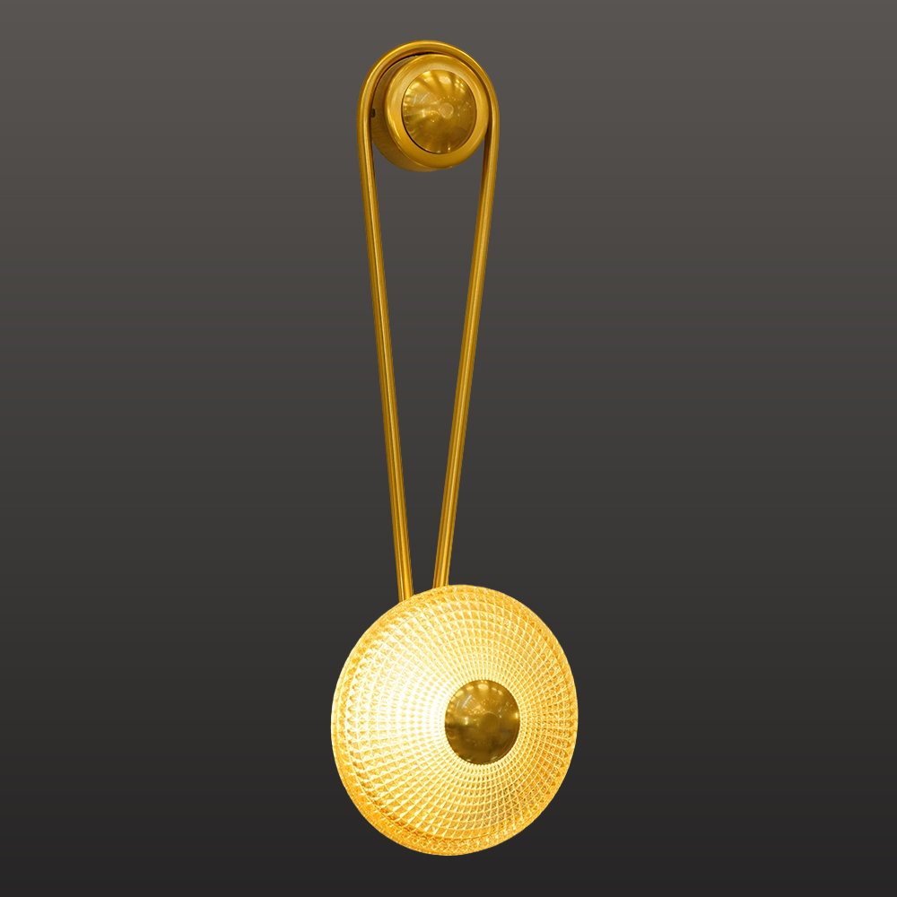 يتميز هذا المصباح الجداري بتصميم عصري . يحيط موزع الضوء الدائري الزجاجي المزخرف بقطعة مركزية ذهبية مصقولة، ناشرًا ضوءًا ناعمًا ومتوهجًا . مدعوم بحاملين أنيقين متصلين بحامل حائط دائري، يمزج هذا المصباح بين الأناقة العصرية والفخامة.