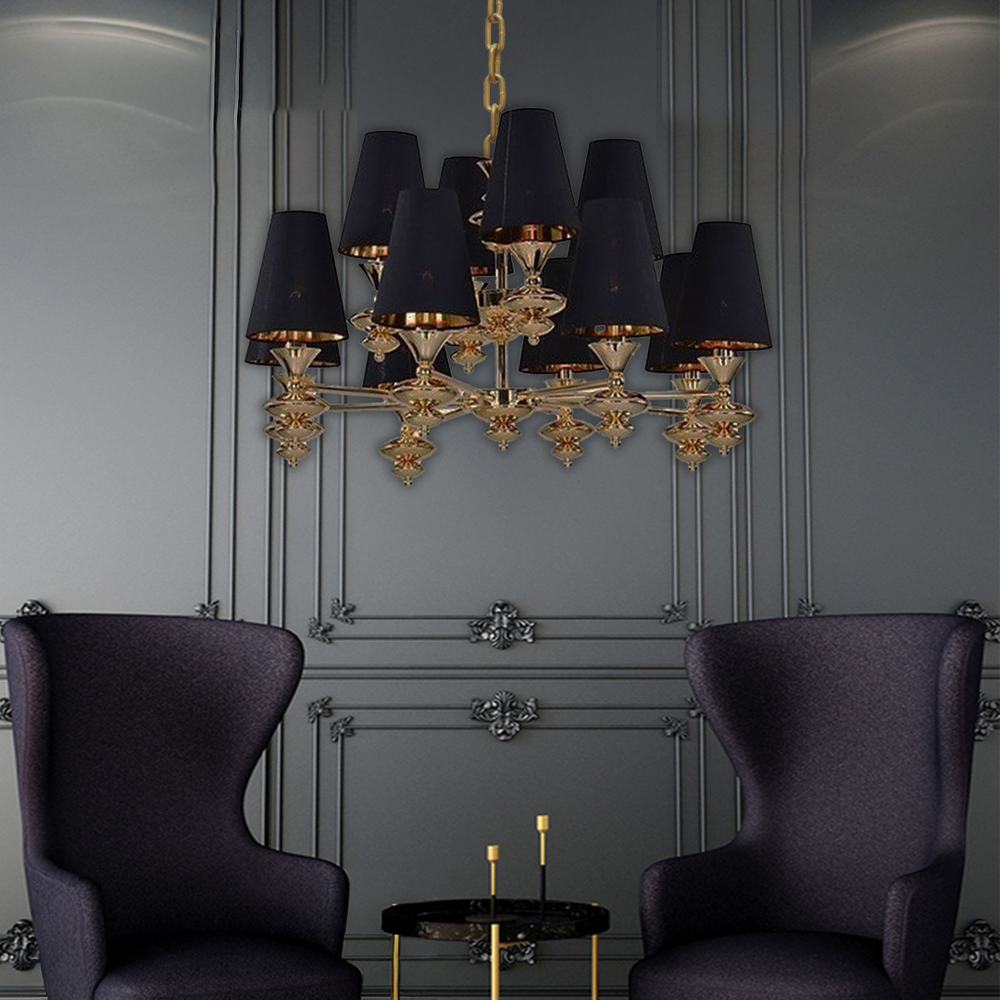 ثريا مصنوعة من المعدن المطلى وقبعة بشكل مخروطي مقطوع، يتميز باللون الأسود مع الجزء الداخلي بلون ذهبى، هذا التصميم لمسة عصرية وفاخرة تجمع بين أناقة اللون الذهبي وجرأة اللون الأسود، مما يجعلها قطعة مميزة في الديكورات الداخلية الحديثة والمعاصرة تناسب