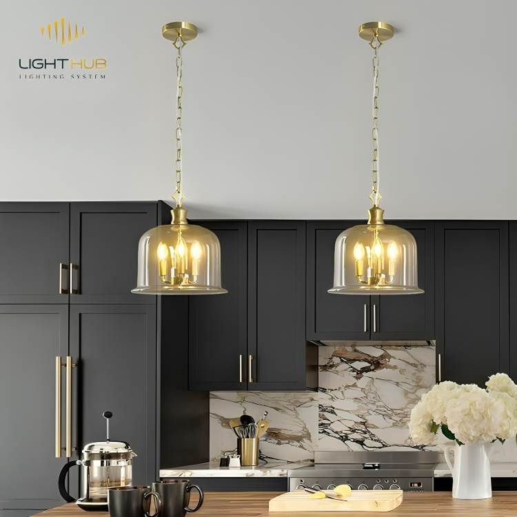 تتميز بشكل جرس مقلوب بخامة زجاجية بلون دخاني Smoked Glass مع لمبات على طراز الشمعدان معلقة بداخله، مثالي لإضافة لمسة من الدفء إلى: