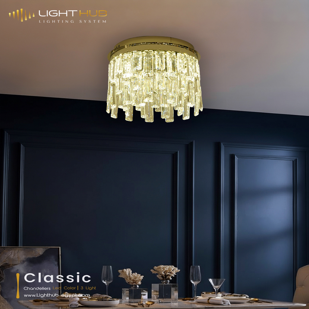 ثريا سقف حديثة بلمسة فاخرة، شكل دائرى تثبت مباشرة على السقف، تتميز بقاعدة معدنية المقاوم للصدأ معلقة بها صفوف متعددة من قطع الكريستال طويلة على شكل مستطيل تتدلى بشكل متدرج، هذا النوع من الكريستال يعكس الضوء بشكل مذهل ويضيف بريقاً فريداً.