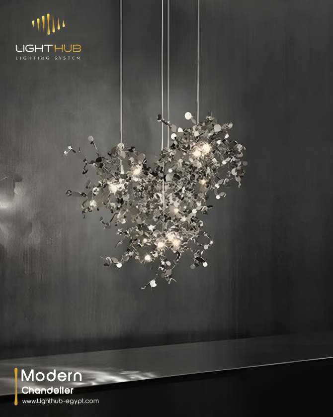 نجف مودرن بلون الفضي اللامع، يمنحكِ لوحة ألوان أنيقة خالدة، تنبض هذه الألوان بالثراء والرقي، مما يتيح لكِ تنسيق إضاءة منزلك بسهولة مع ديكوره الداخلي ويجعل له بريقًا أنيقا