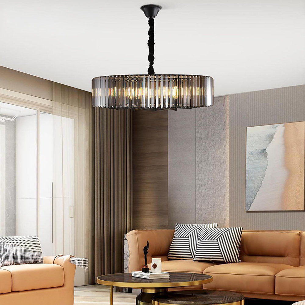 التصميم الدائرى للنجفة من المعدن والكريستال الفاميه الاسود الشفاف، يجمع بين متانة المعدن وخصائص نقل الضوء الفريدة للكريستال مما يخلق تأثير إضاءة غامضه ومميزه.