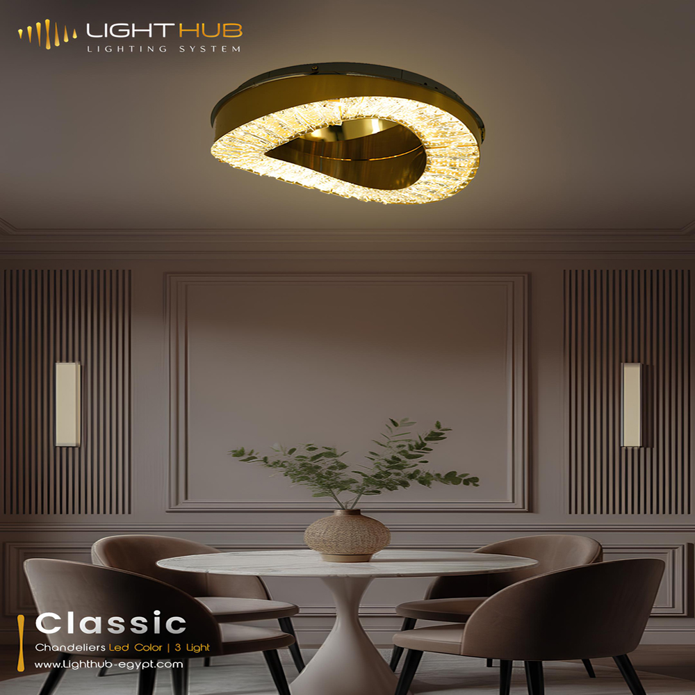 نجفة بتصميم فخم، تأتي بتصميم دائري وتثبيت مباشرة على السقف، تتميز بوجود طبقتين أو حلقتين لعميق المظهر، القاعدة من المعدن المطلى بلمسة نهائية ذهبية مما يعطيها لمسة فخامة، الحلقة الخارجية (الكريستال) الحافة الخارجية محاطة بصفوف كثيفة من الكريستال.