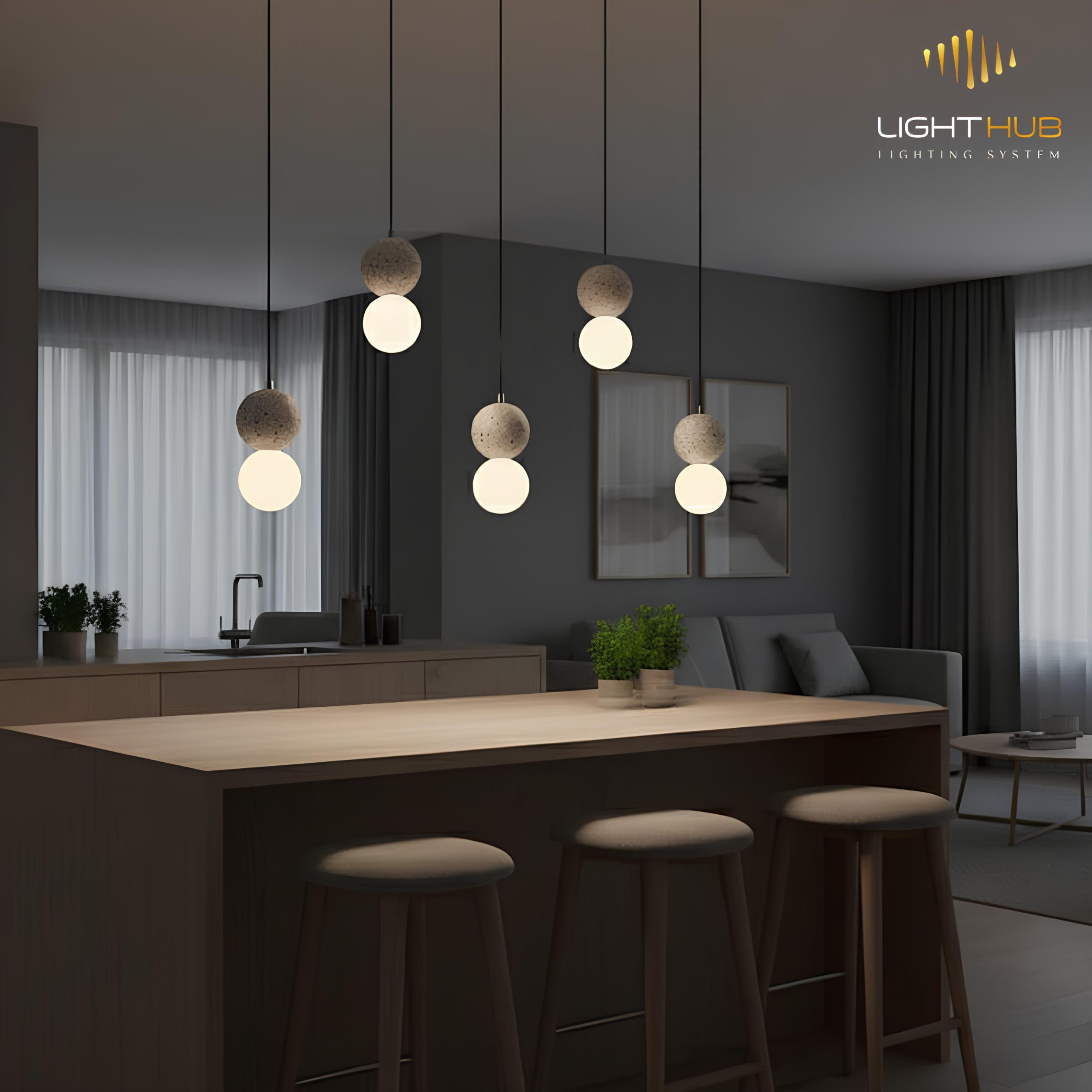 مصباح معلق يجمع بين كرة رمادية منقوشة و كرة سفلية بيضاء