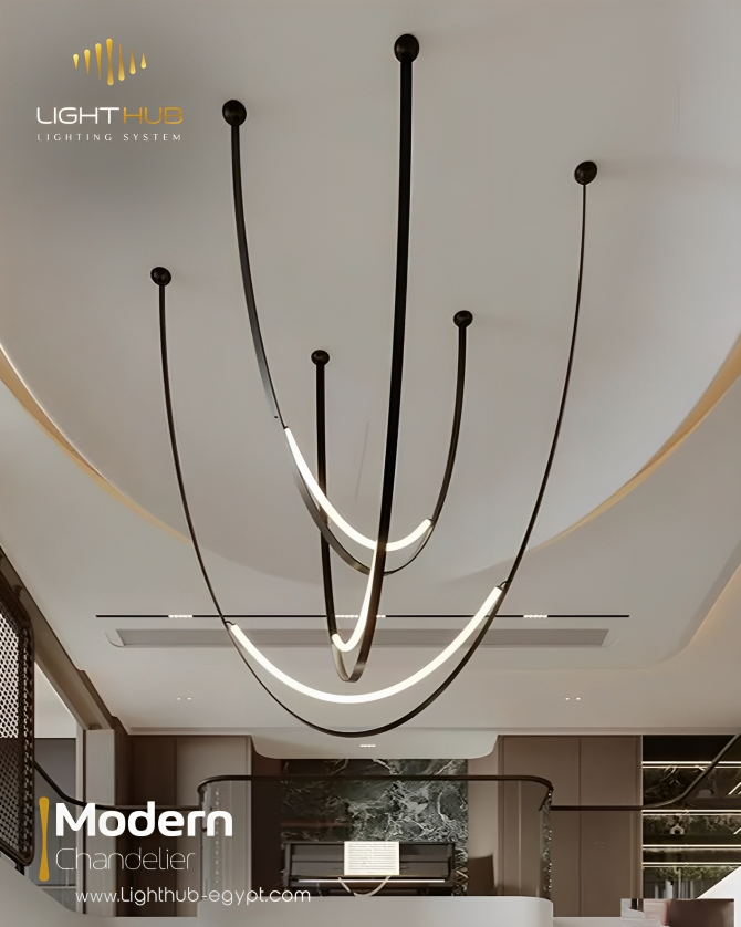 يتميز بتصميم فريد وحديث للغاية، مكون من عناصر منحنية أو على شكل حرف U، مصنوعة من المعدن والجلد, تستخدم لمبات LED مدمجة والتي تتميز بكفاءة استهلاك الطاقة وتوفر إضاءة دافئة ومريحة.