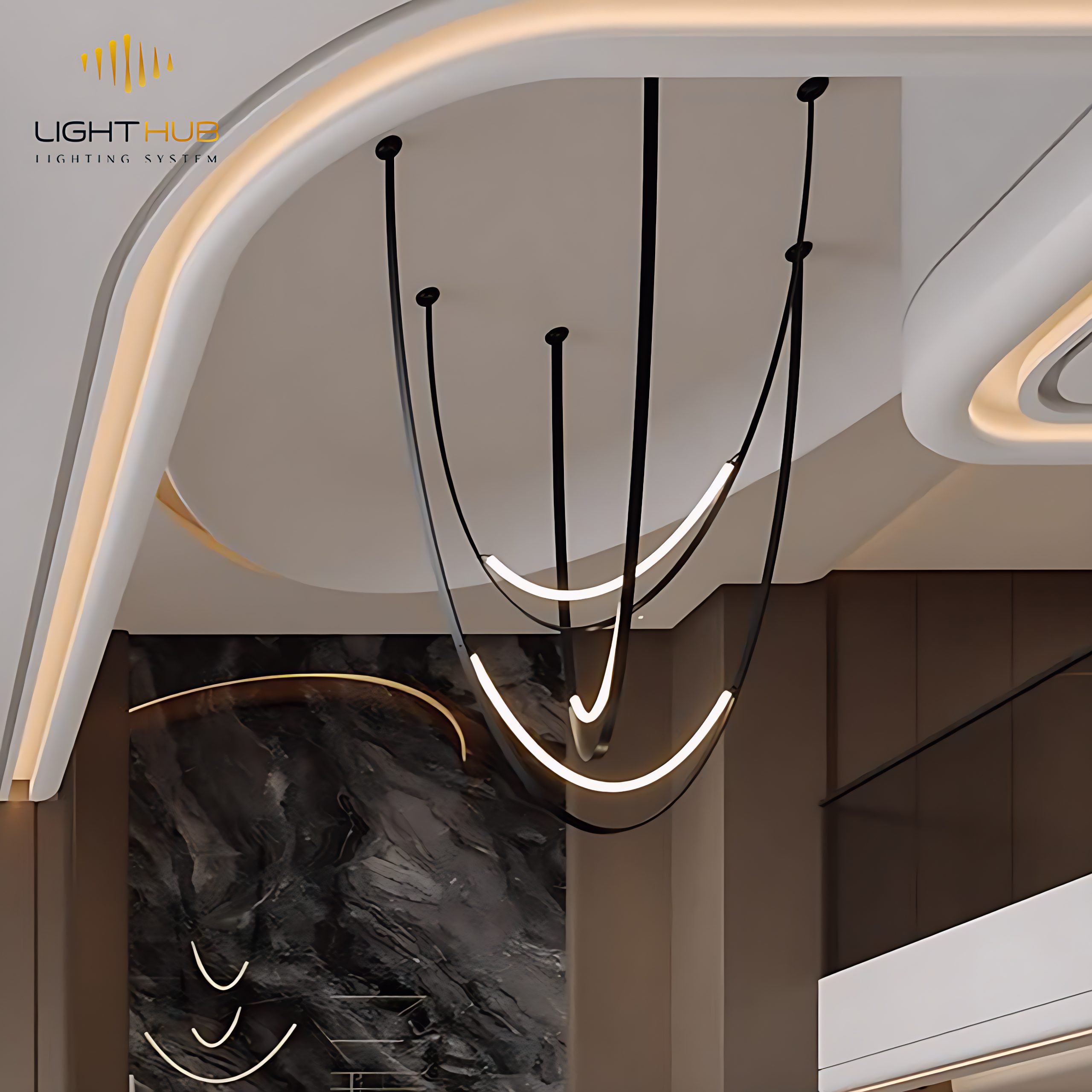 يتميز بتصميم فريد وحديث للغاية، مكون من عناصر منحنية أو على شكل حرف U، مصنوعة من المعدن والجلد, تستخدم لمبات LED مدمجة والتي تتميز بكفاءة استهلاك الطاقة وتوفر إضاءة دافئة ومريحة.