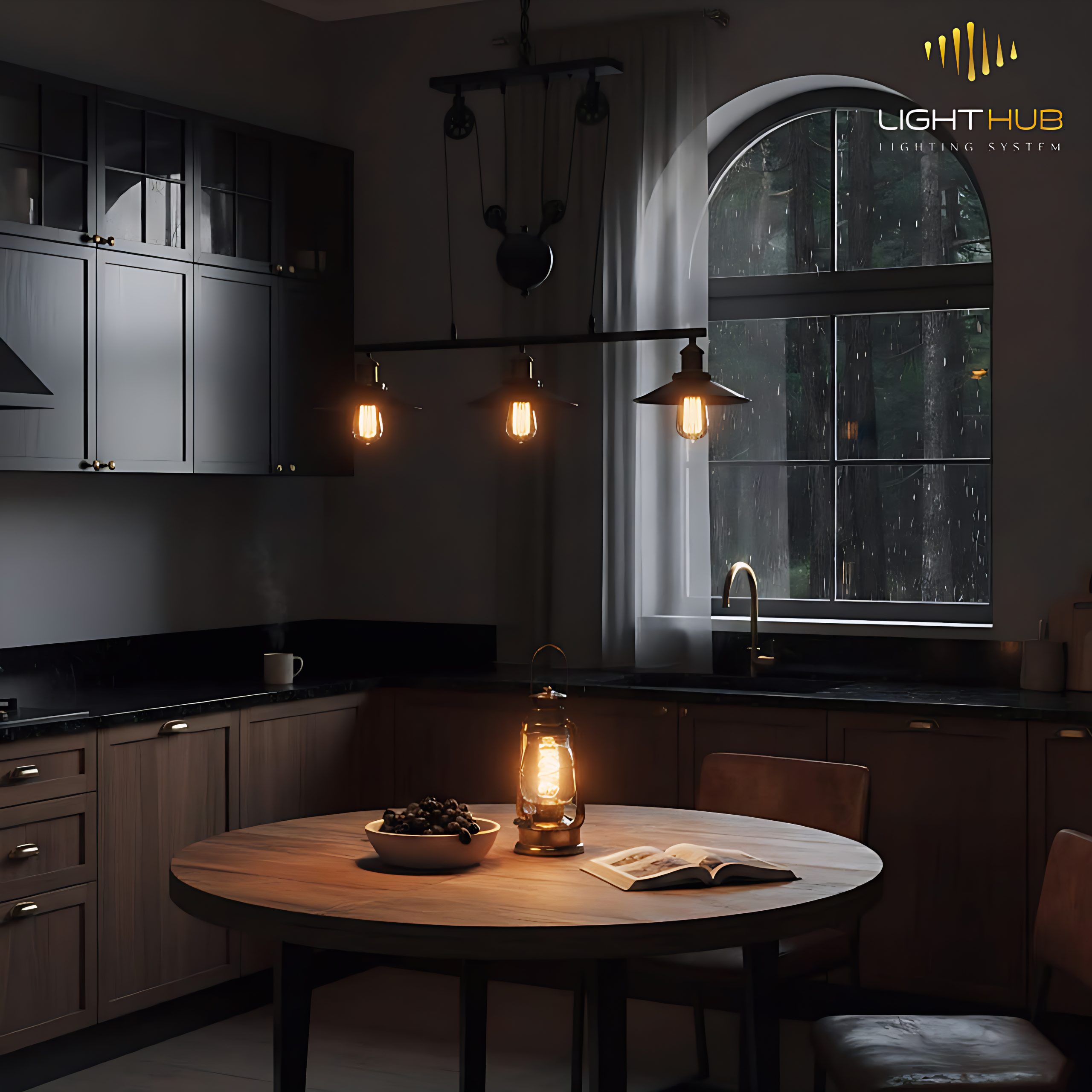 معلقة من المعدن الأسود بثلاثة مصابيح، قابل للتعديل، للطاولات، بارات المطابخ، غرف الطعام.