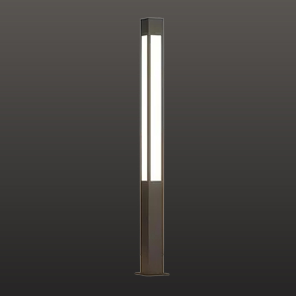 عمود إنارة حدائق ليد، بتصميم يركز على توفير إضاءة محيطية عالية وواضحة، يتميز بشكل مستطيلي ذو زوايا ، مما يعطيه طابعاً حديثاً ومعمارياً ، يتكون من جزء سفلي صلب وغير مضيء، وله قاعدة تثبيت، اما الجزء المضيء يغطي جزء كبير جداً من ارتفاع العمود تقريباً، ويتكون غطاء ناشر للضوء، مما يسمح للضوء بالانتشار بكفاءة بسبب المساحة الكبيرة المضيئة، يوفر هذا الموديل إضاءة محيطية شاملة (Omnidirectional)، أي أنه يضيء محيطه بالكامل بشكل متساوٍ، مما يجعله مثالياً لإنارة المناطق المفتوحة والمسارات العريضة، مما يهدف إلى تحقيق مستويات إنارة عالية وموحدة على الأرضية المحيطة به.