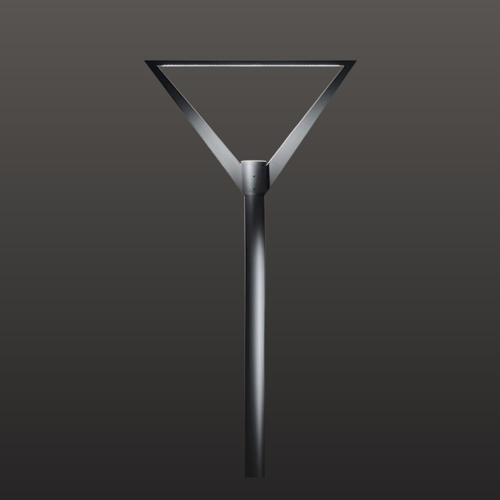 عمود إنارة الحدائق “الرأس المثلثي”، يتميز هذا الموديل بتصميم فريد يركز على إنشاء شكل هندسي بارز في الجزء العلوي، مما يجعله قطعة فنية مضيئة، يتوج العمود بإنارة ذات شكل مثلثي، حيث يتفرع الجسم إلى خطين مستقيمين يلتقيان في الأعلى مع خط عرضي، مما يشكل إطاراً مثلثياً، أن العمود مصنوع من معدن مطلي بلون معدني (اسود أو رمادي)، مما يعزز المظهر الجريء، تصميم جذاب للغاية، ومناسب للمناطق التي يراد فيها أن تكون الإنارة عنصراً جمالياً معمارياً بحد ذاتها، الضوء المنبعث من هذا العمود يخلق ظلاً فريداًوتأثيراًضوئيا متساوياً على الأرض، مناطق الاستخدام: الساحات والمناطق المفتوحة: حيث يمكن لعدة أعمدة من هذا النوع أن تخلق نمطاً ضوئياً موحداً ومميزاً، مداخل المباني الحديثة ومقار الشركات: لإضافة لمسة فنية ومهنية عالية، الحدائق المعمارية: كمحددات بصرية للطرق ومناطق الجلوس.