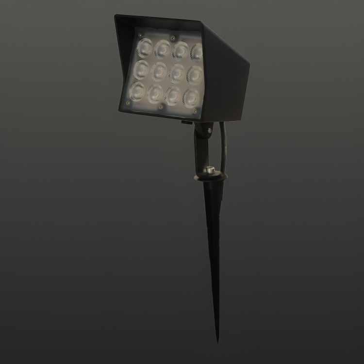 كشاف توجيه خارجي، مصمم خصيصاً للتثبيت في الأرض أو العشب باستخدام حربة، تاتى الوحدة على شكل غطاء مستطيل باللون الأسود، تحتوي كل وحدة كشاف على مصفوفة من شرائح LED صغيرة وهذا التصميم يهدف إلى توفير إضاءة قوية وموجهة، مناسبة للحدائق لتسليط الضوء على النباتات والأشجار، تحديد المسارات والأركان في المناظر الطبيعية، إضفاء عمق وجمالية على المشهد الخارجي ليلاً.